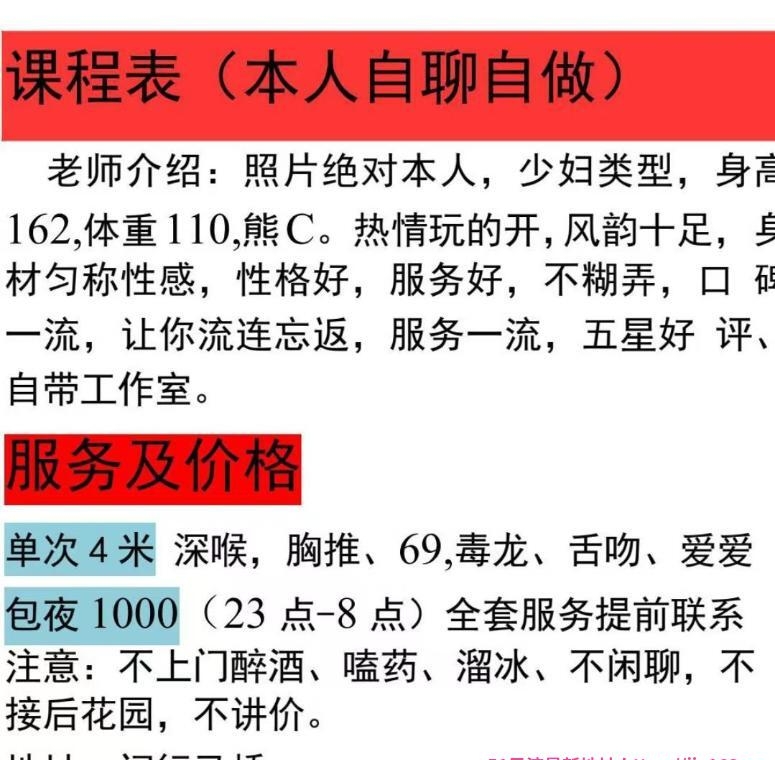 在宝安西乡附近的少妇,她说过年期间也会在深圳这边的,身高一米六左右,胸大,有36D,摸起来又软又有弹性,是真凶,腿也很细,四米一次,带服务的,不是快餐,服务不敷衍,按课表上的都会做到,八米两次,服务更多,有抓龙筋按摩,姐姐还有业课,饿了还会给你点宵夜啥的一起吃,还会特色口深喉一绝,口活很舒服,她还有一个姐妹一起的,可以双飞哦,姐妹是兼职的,有时候不在,需要提前月的;